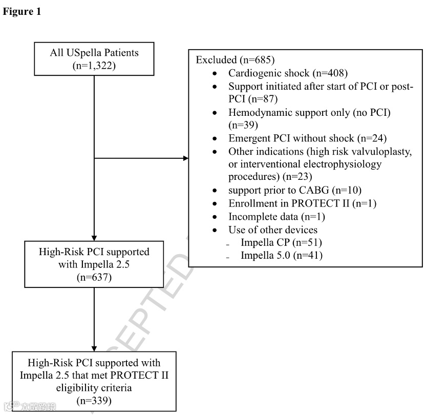 从2007年11月到2010年12月,共有来自从2007年6月到2013年9月,共有来自美国的47家中心和加拿大的2家中心的接受过Impella 2.5,Impella CP和Impella 5.0/LD的1322名患者进入USpella登记。其中637名患者应用Impella辅助高危PCI患者的治疗,并作为本次分析的研究人群,其入组条件与不良事件的发生率定义相同。