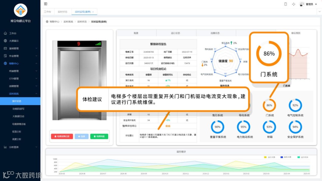绰立电梯遥监云平台进行了功能升级,电梯预测式维保取得新突破。绰立电梯遥监云平台能对电梯设备实现实时远程互联和数据分析,将项目管理、安装调试、检验派工及记录等电梯维保过程无纸化,并通过算法和大数据建模,智能判断故障情况并作出预置方案,达到风险提前发现、预警提前发布、方案提前制定、措施提前实施的作用,使电梯维保从传统的故障维修和计划性维护,跨越至前瞻式、预测式维保升级,推动电梯安全风险从被动应对向主动防控的转变。