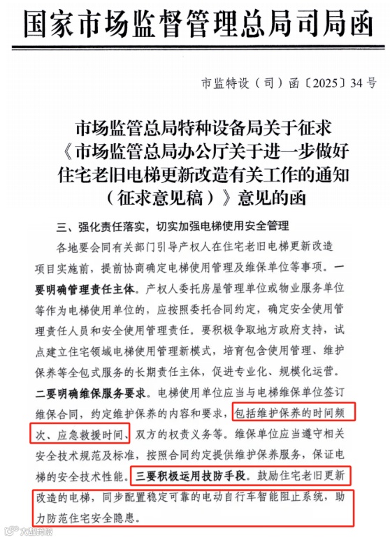 日前,国家市场监督管理总局发布《关于进一步做好住宅老旧电梯更新改造有关工作的通知(征求意见稿)》,系统规划电梯安全管理升级路径。该征求意见稿明确提出强化维保服务标准与技防手段应用。政策强调需建立维护保养规范,并鼓励加装电动自行车智能阻入系统,为住宅电梯安全防控提供方向指引。