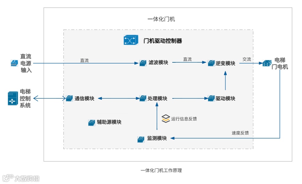 电梯门机主要包括两个部分:门机驱动控制器和门电机。门机驱动控制器接收电梯控制系统的指令,控制门电机的运转,使门机传动带带动轿门和门刀沿着导轨滑动,从而实现电梯门的开关。而一体化门机实现了门机驱动控制器和门电机的深度融合,集成了开关门逻辑处理与电机驱动控制,电梯控制系统只需给出开关门指令,即可实现对整个门系统的控制。其中门机驱动控制器包括滤波模块、逆变模块、驱动模块、监测模块、辅助源模块、处理模块、通信模块。门机驱动控制器的核心技术是变频,通过逆变模块将输入的直流电逆变输出为频率和幅值可控的三相交流电,输出到电动机,从而控制门电机的转向及速度。而其他各个模块均是围绕此功能工作的。