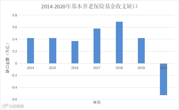 2020年,我国基本养老保险基金收入大幅下降,仅为4.87万亿元,而基本养老保险基金的支出不减反增,达到了5.45万亿元,养老基金首次出现了结余为负数,缺口额高达5851亿元。