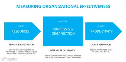 衡量组织有效性很复杂。不同的模型提供了不同的观点来评估有效性。例如,基于资源的模型衡量输入,内部流程模型衡量流程有效性,而基于目标的模型衡量组织的输出。