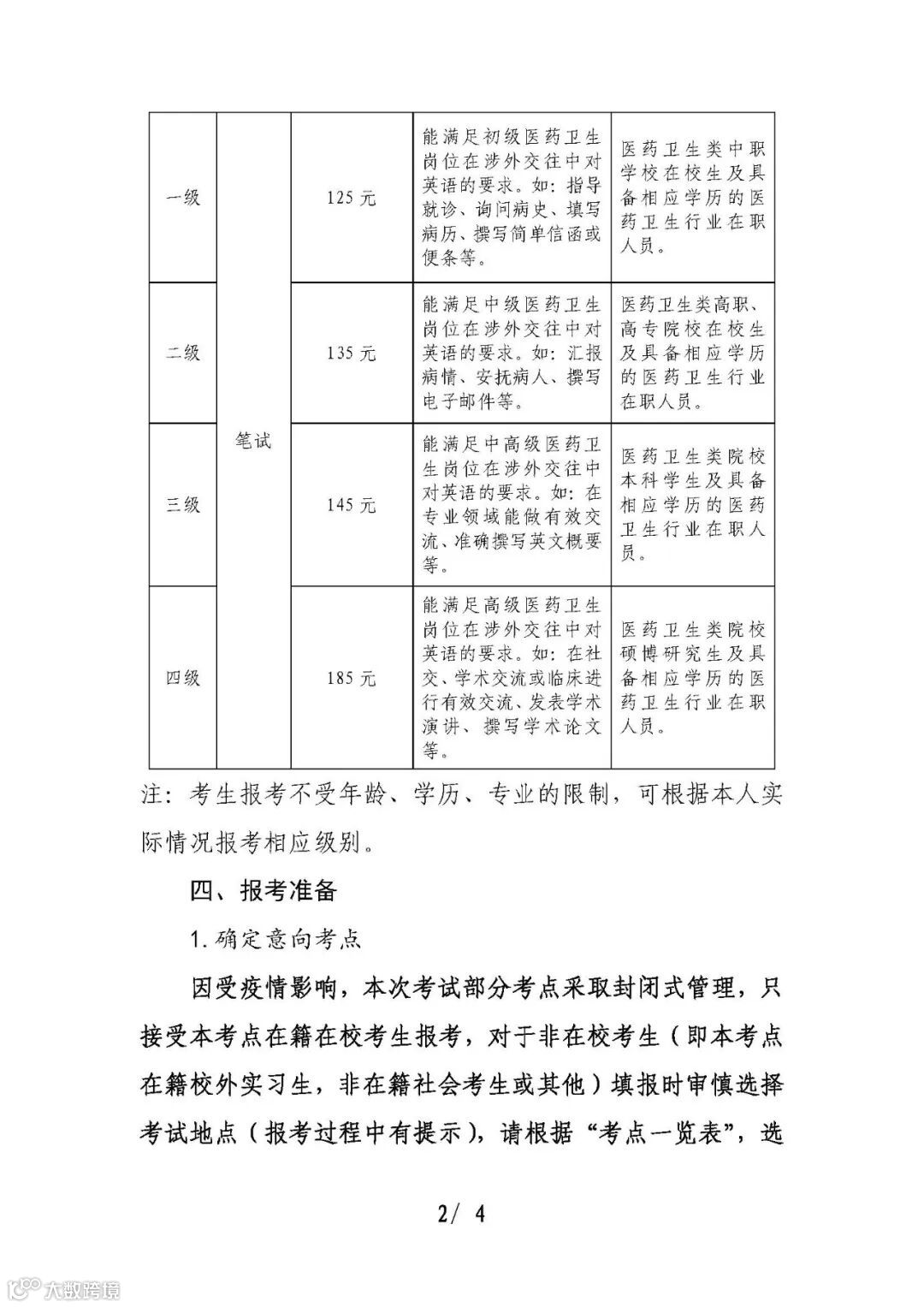 医护英语水平考试四级:建议医药卫生类各专业硕士、博士研究生和在职卫生专业技术人员参考。