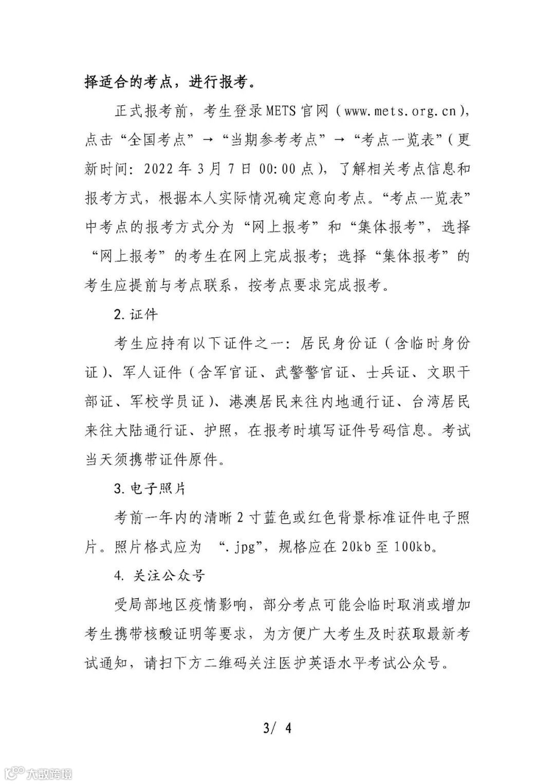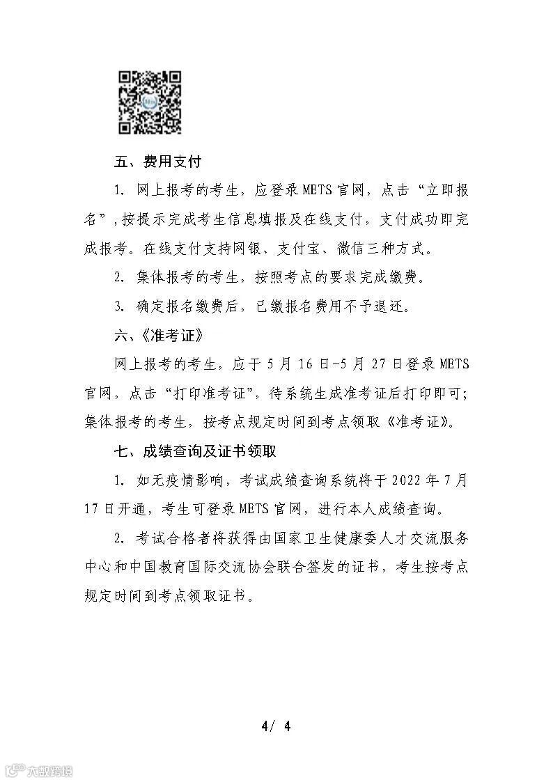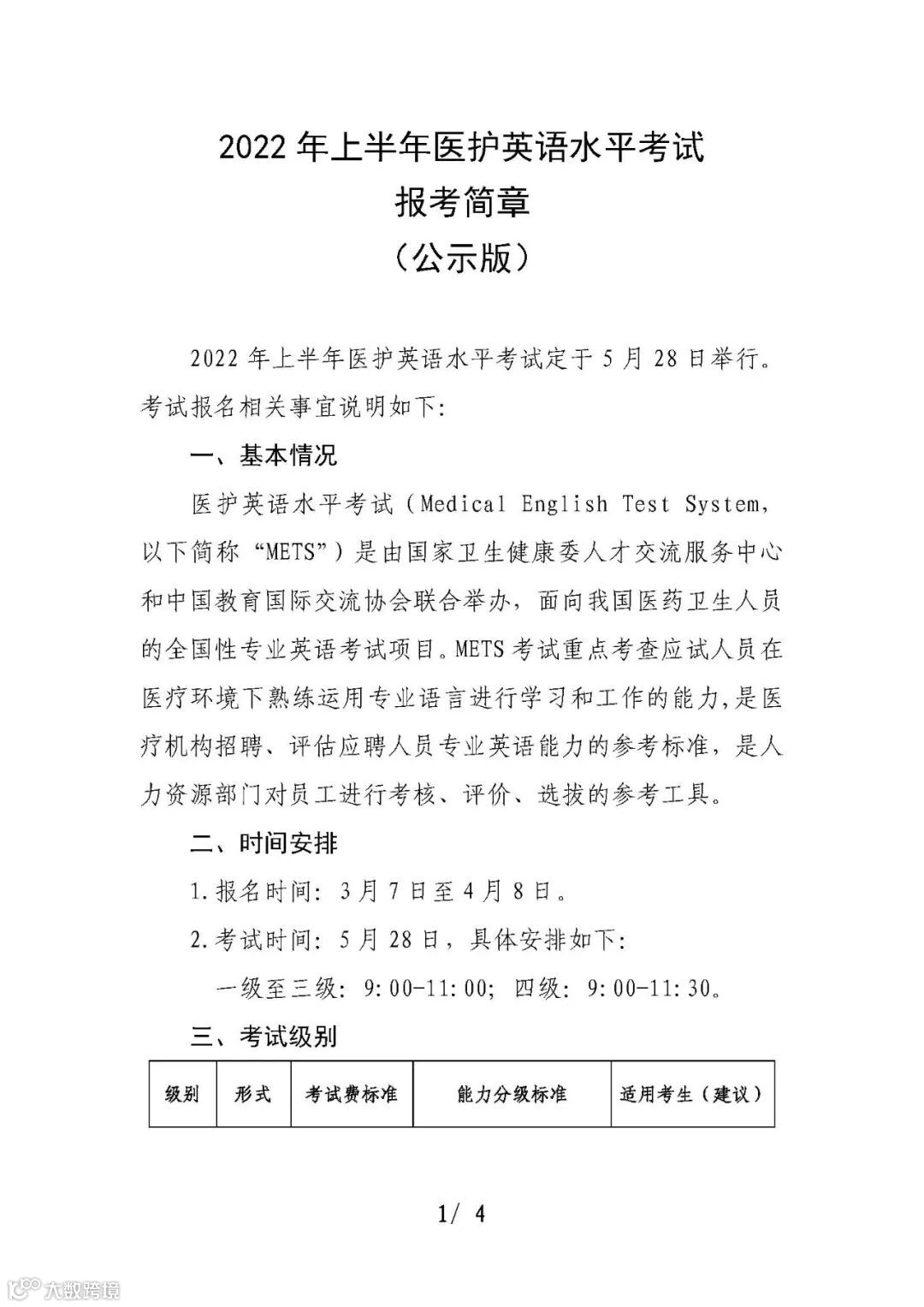 根据国家卫生健康委人才交流服务中心、中国国际教育交流协会际协【2022】14号文件要求,2022年上半年医护英语水平考试(以下简称METS)定于5月28日在各考点举行,报名时间为3月7日-4月8日。