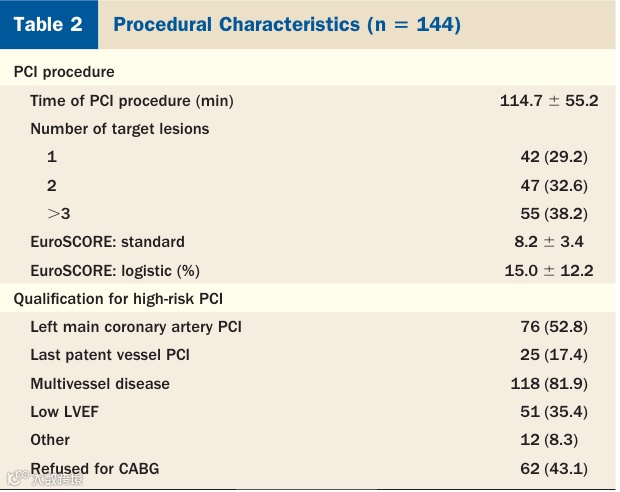 从2004年7月到2007年12月,共有144名高危PCI患者接受Impella的机械辅助循环的支持(排除48小时内发生ST段抬高的心肌梗死或者心原性休克或者急诊PCI患者)患者的年龄和合并症较高,48.6%的病人射血分数低于30%。