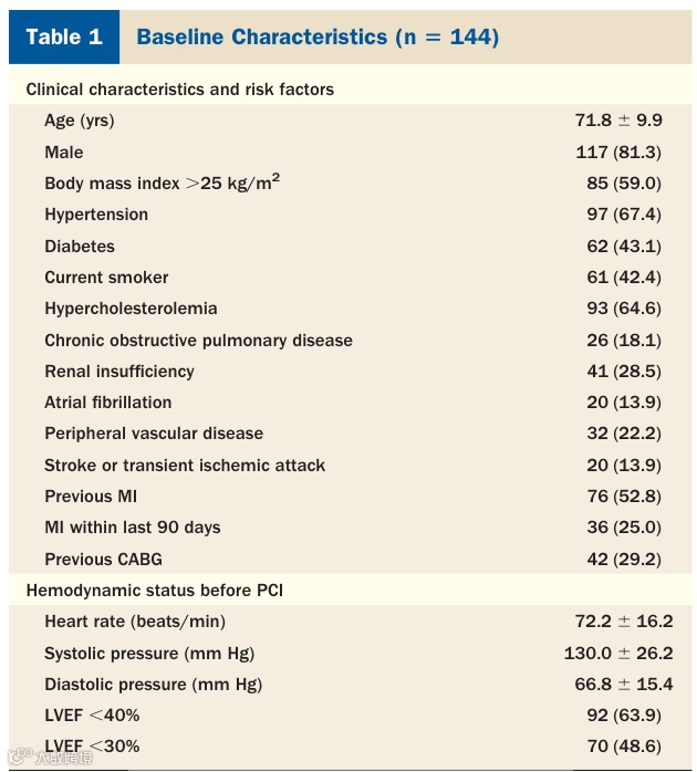 前瞻性、多中心、单臂研究分析了144位高危PCI患者(平均年龄71.8岁,男性81.3%)。