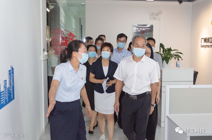 市番禺区区长陈德俊等领导一行莅临广州绰立科技有限公司位于番山智库总部园区的研发中心,实地考察企业在疫情防控和复工复产后的工作情况,我司曾总、雷总、吴总全程陪同。