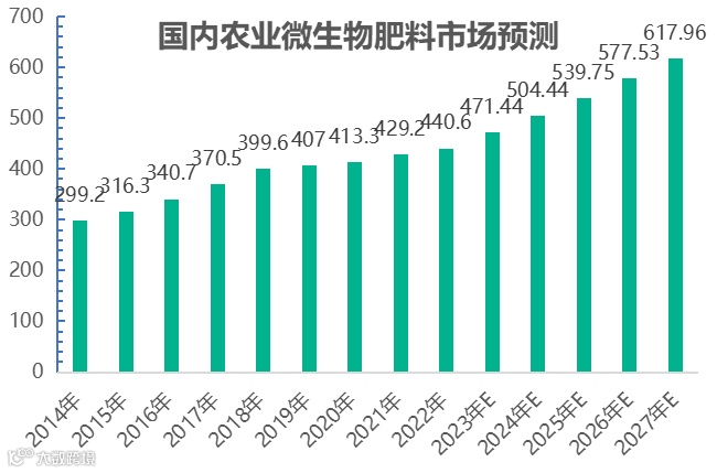 根据下图可以得出,2014年到2022年,国内微生物肥料市场增长141.4亿元,年复合增长速率达5.25%。除因新冠疫情影响行业发展,2019-2021年增速放缓,其余年份均能保持超过7%的市场增速。据推测,到2027年,国内微生物肥料的市场份额将达到617.9亿元。