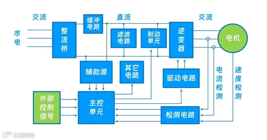 变频器实际是一个交流可调电源,内部主要由整流桥、滤波电路、逆变器、制动单元、驱动单元、微处理单元、检测电路以及其它功能电路构成。我们知道,市电的频率以及电压都是固定不变的,而曳引机想要实现变速,需要改变其电源的频率,同时为了防止磁芯过饱和或弱磁,还需要改变其电源电压的大小。变频器的整流桥将交流市电转变为直流电,直流电通过滤波电路滤除杂波和稳压后到达逆变器,变频器的主控单元通过驱动单元控制逆变器内部IGBT的开关顺序、开通占空以及开关频率,便能将直流电转变成频率、电压及相序均可调的交流电,变频器因此便能够控制曳引机的转向以及转速。除此之外,曳引机的实时电流及转速信息也会通过相应检测电路反馈回变频器的主控单元,形成闭环控制,维持系统的稳定。