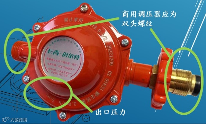 判定说明:商用调压器产品颜色为桔红色,明显位置标有“禁止家用”字样,其中家用(代号JYT)、商用(代号SYT桔红色);产品身上或说明书上标明的出口压力不得大于5.0kpa;出口连接为双螺纹;调压器压力不可调节