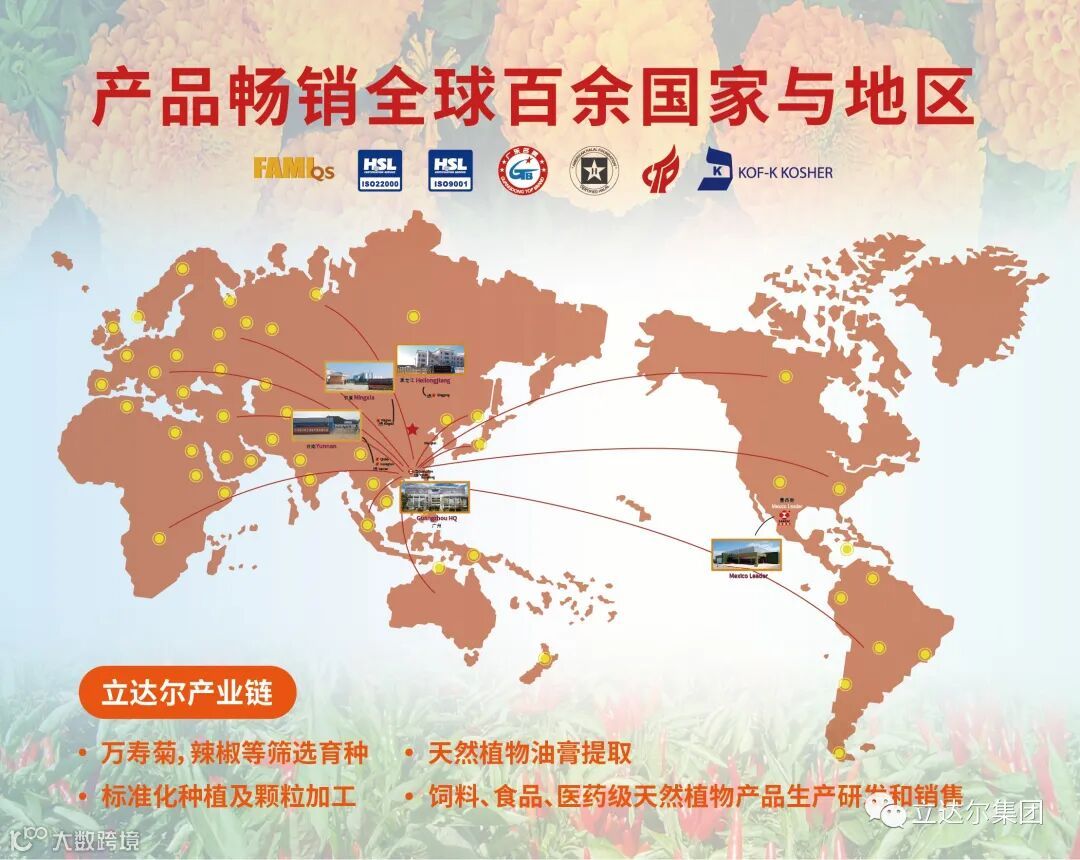 真诚感谢众多客户和商家对我们多年以来的厚爱与支持,立达尔集团面对当前复杂、不确定性的国际经贸环境,十三年前开始从全产业链布局出发(自研种源、育苗栽培技术、发展规模化种植、自建颗粒加工厂、油膏提取厂、食品加工生产线。目前产量稳居行业前列,逐步解决产业链“卡脖子”问题。在脱贫攻坚的大背景下,立达尔通过发展万寿菊、辣椒合作社种植,先后带动20多万农户彻底脱贫致富,为多年脱贫战略贡献一份力量。站在十二五规划新的起点上立达尔集团迈着更加自信的步伐,深耕中国植物提取精深加工领域,为世界增味添彩!