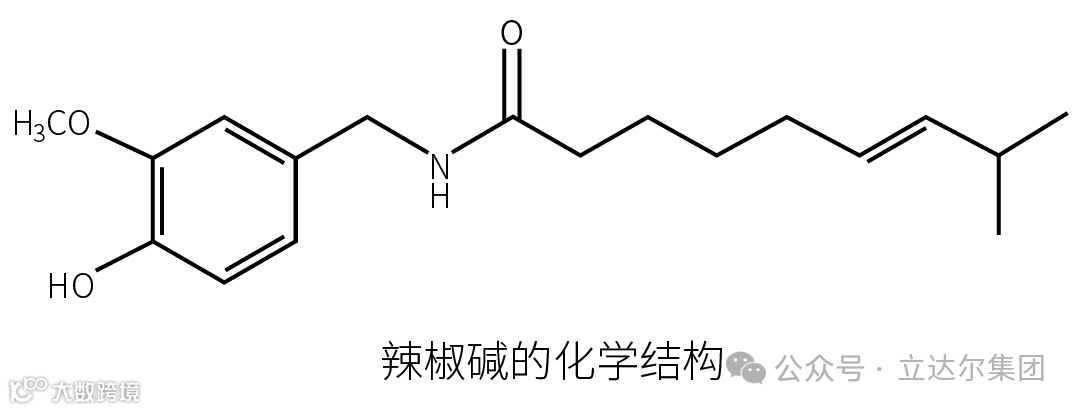 辣椒为茄科植物辣椒的果实,其呈辣的主要物质是辣椒中的辣椒碱,是一种香草酰胺类生物碱, 主要存在于果实的胎座组织及果皮和籽中。辣椒碱在果实中的含量极不均匀, 胎座中含量最高, 果肉次之, 种子中含量最低。高纯度的辣椒碱为白色片状或针状结晶或白色粉末, 其分子式如图: