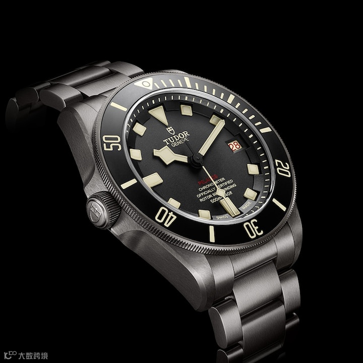 哑光黑色陶质字圈,搭配米色夜光刻度,在昏暗的水下环境里,也依旧能保持着清晰的读时效果。备以钛金属表带,内设自动调节弹簧装置,易于佩戴。