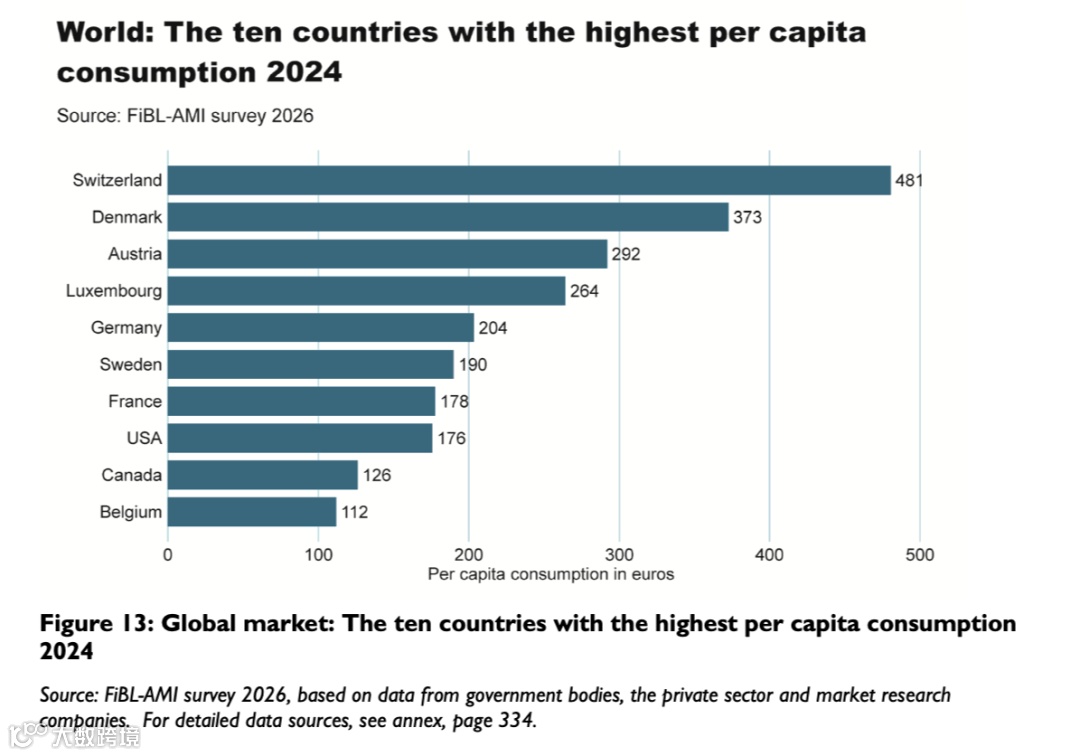 2024年,全球人均有机产品消费约为18欧元;瑞士排名第一,为481欧元,其次是丹麦373欧元,奥地利292欧元以及卢森堡264欧元。中国截至2024年的人均消费达到11欧元。