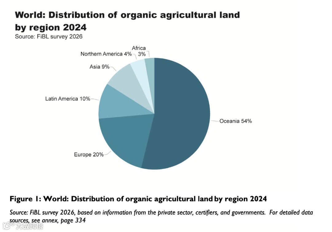 2024年全球有机农业数据显示,有机行业正在稳步发展。全球有机农地面积达到9890万公顷;其中大洋洲面积最大,为5320万公顷,占全球有机农地面积的54%;其次是欧洲,面积为1960万公顷,占20%。