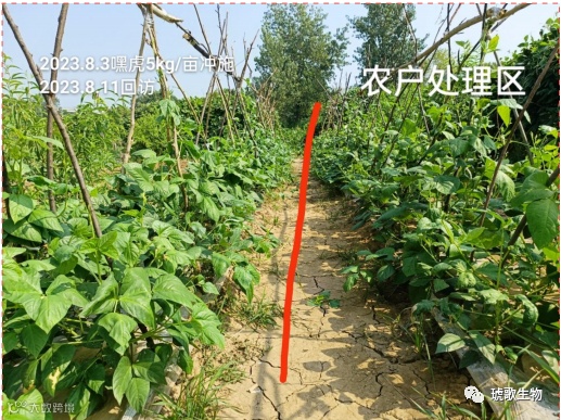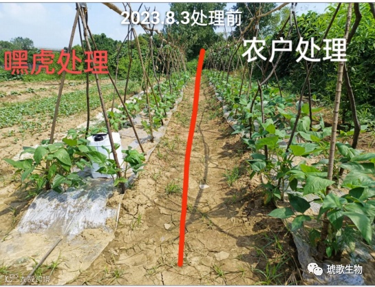2023.8.3试验前,嘿虎TM处苗势远弱于农户处理区,进行长势追赶验证