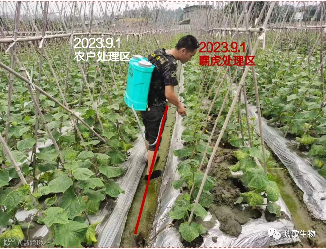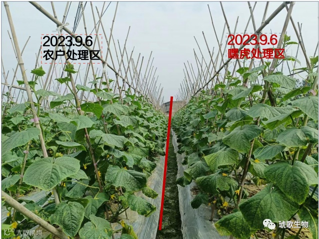 嘿虎TM黄瓜冲施示范总结:在黄瓜上使用嘿虎5kg/亩冲施,黄瓜长势更快,叶片更绿;嘿虎™处理区叶片更加舒展,抗逆性更强。
