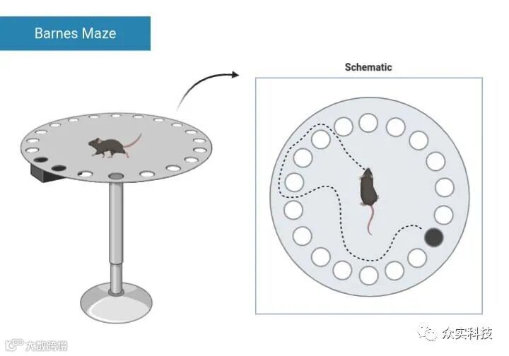 Barnes 迷宫是利用啮齿动物喜暗避明的习性设计,通过强光照射与噪声刺激迫使动物在规定时间内寻找指定位置孔洞下的暗箱。实验分为训练期和测试期,连续训练几天后测试,记录动物进入暗箱的时间、总路程、速度等,以及进入错误洞口的次数以反映动物空间参考记忆能力,也可以通过记录动物重复进入错误洞口次数来测量动物的工作记忆。