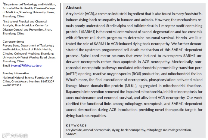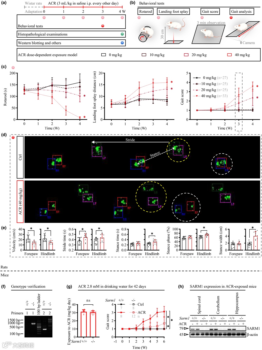 FIGURE 1 ACR induces SARM1-dependent hindlimb dyskinesias. (a) Schematic diagram of ACR exposure in rats. (b) Schematic diagram of the neurobehavioral evaluation experiments in rats. (c) Neurobehavioral performances of rats subjected to 0, 10, 20, and 40 mg/kg ACR. Panels from left to right are rotarod, landing foot splay distance, and gait score. *: p<0.05 compared to corresponding controls. (d) Footprints of rats exposed to 40 mg/kg ACR for 3 weeks. Rats exposed to ACR for 4 weeks drag their hindlimbs and could not produce footprints, and the relevant data are not shown here. The track direction is from right to left. Pink, red, green, and blue represent left front (LF), right front (RF), left hind (LH), and right hind (RH), respectively. The yellow and white circular dashed boxes indicate the overlapping pattern of fore and hindlimbs on the same body side. Parameters like stride and stance width are measured and graphically represented. (e) Quantitative analysis of footprints. For interpretation of these parameters, the reader is referred to the Materials and Methods. The dot indicates the mean values of multiple-step cycle-related indicators in one trail. *: p<0.05. (f) Genotype validation of Sarm1 knockout mouse model (C57BL/6). (g) Exposure and gait score of mice that are given drinking water freely with 2.8 mM ACR for 42 days. The left panel shows the estimated ACR exposure dose based on daily water intake and body weight, with each data point representing one mouse. The right panel shows the gait change of mice with different genotypes. *: p<0.05, comparison between groups. (h) Expression of SARM1 in different neural tissues of ACR-intoxicated mice. It is important to point out that only the results in f–h are obtained from mice in the full text. The other unspecified animal results come from rats, whose metabolic profile of ACR is closer to that of humans.