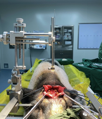 2) 确定注射位点:头皮外确定钻孔位置,标记于颅骨。海马:以颧弓为骨性标志,参考广西猕猴脑立体定位图谱,耳间线平面向前11.6mm,水平面(眶下缘与外耳道中点连线)向上7mm,即为海马注射点;