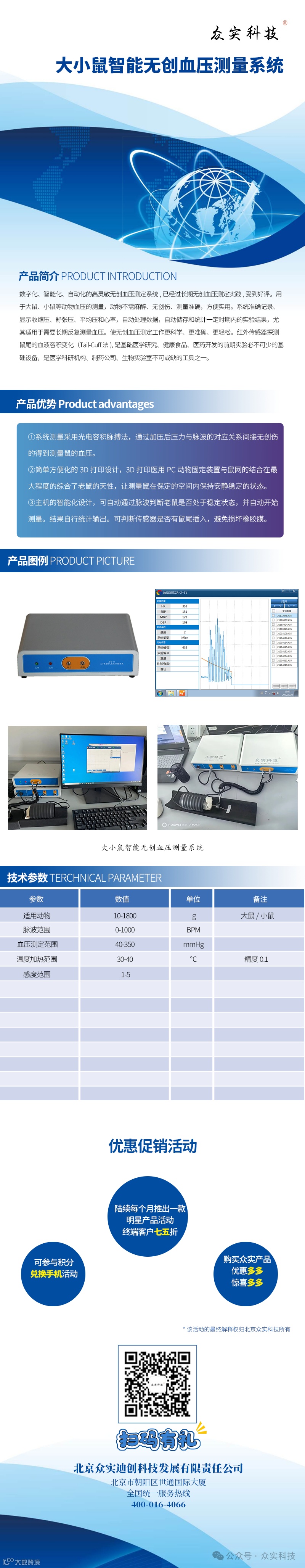 众实科技数字化、智能化、自动化的高灵敏无创血压测定系统,已经过长期无创血压测定实践,受到好评。用于大鼠、小鼠等动物血压的测量,动物不需麻醉、无创伤、测量准确,方便实用。系统准确记录、显示收缩压、舒张压、平均压和心率,自动处理数据,自动储存和统计一定时期内的实验结果,尤其适用于需要长期反复测量血压