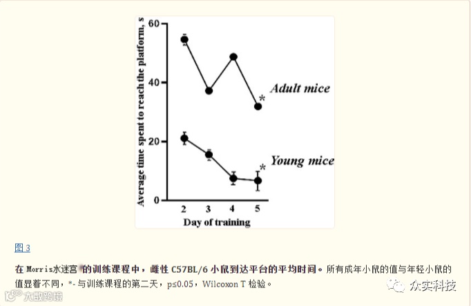 我们的研究表明,在正常状态下,与年轻小鼠相比,成年小鼠在Morris水迷宫训练课程中不太适合空间学习,并且花费更多时间达到目标。