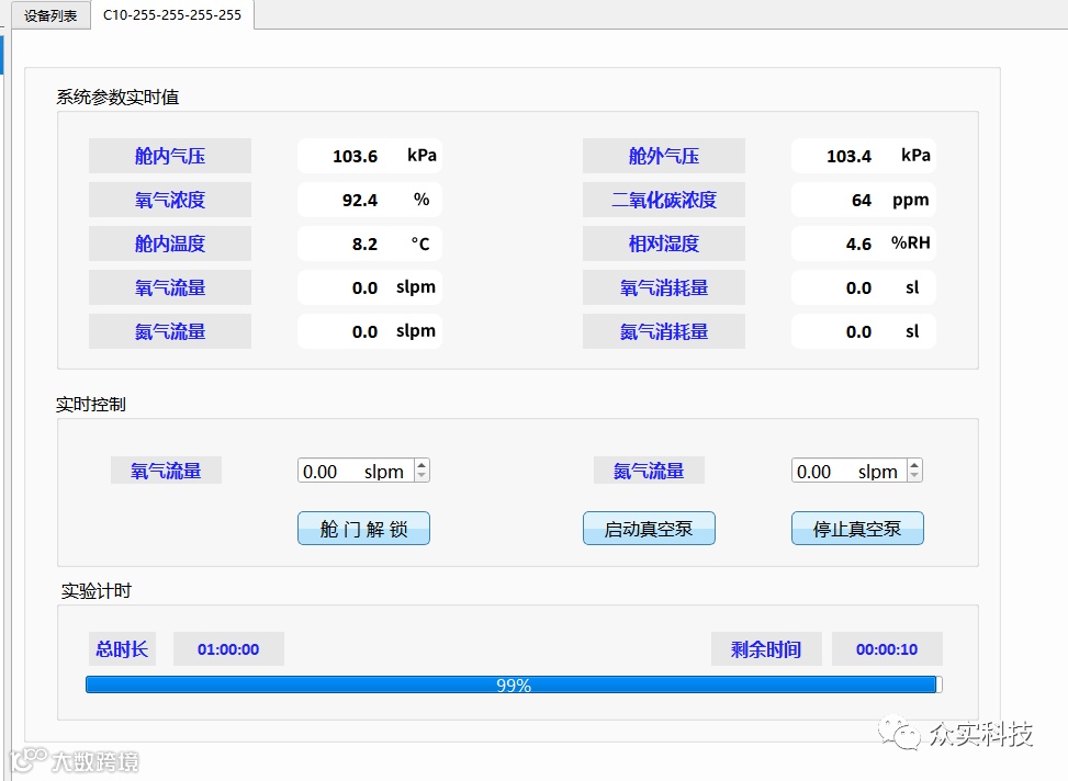 8.温度显示功能监测参数:温度、湿度、氧气浓度、氧分压、舱内的压力、模拟海拔高度;氧气浓度变化动态曲线,直观了解氧气浓度变化的过程;海拔高度动态变化曲线,实时观测实验情况,低温循环功能(选配)