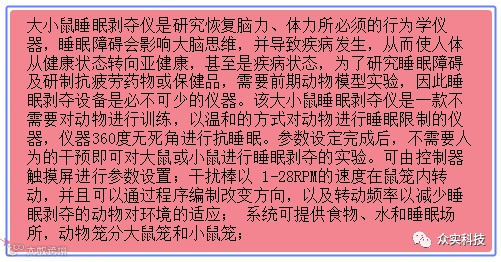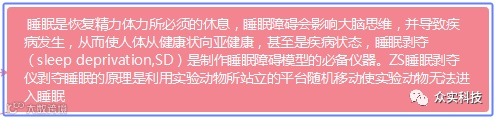 众实科技大小鼠睡眠剥夺仪是研究恢复脑力、体力所必须的行为学仪器,睡眠障碍会影响大脑思维,并导致疾病发生,从而使人体从健康状态转向亚健康,甚至是疾病状态,为了研究睡眠障碍及研制抗疲劳药物或保健品,需要前期动物模型实验,因此睡眠剥夺设备是必不可少的仪器