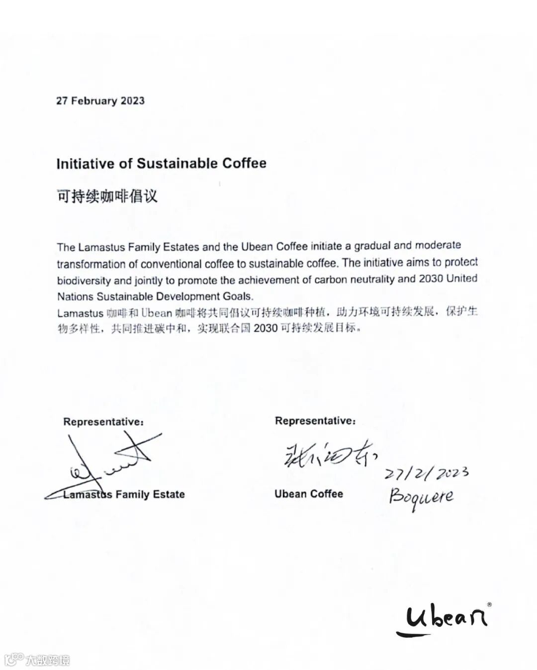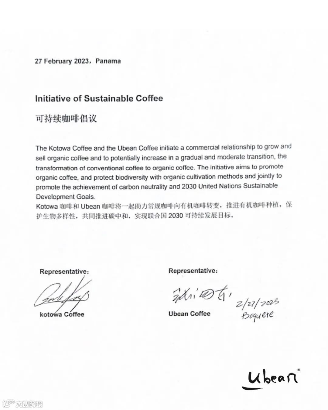 张向东与Wilford Lamastus,有豆Ubean瑰夏种植地块,Elida Estate FALDA LOT(图1)。Ubean瑰夏咖啡2块种植地块(图2)。有豆Ubean分别与Lamastus Family Estate、Kotowa Coffee在巴拿马签署“可持续咖啡倡议”,共同推进当地的可持续咖啡种植(图3,4,5)。