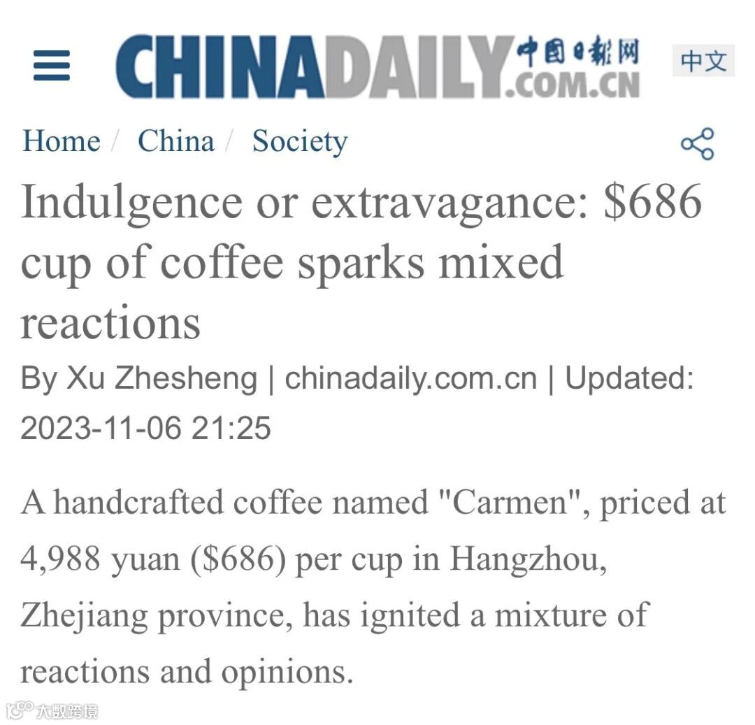 据China Daily,近日杭州一家咖啡店推出686美元(人民币4988元)一杯的咖啡引发热议[1]。该咖啡店称所使用的咖啡豆为来自2023年BOP “巴拿马最佳咖啡豆竞赛”的冠军咖啡豆,并创造了杯测平均分96.5的成绩[2]。这支来自巴拿马卡门庄园(Finca Carmen Panama)的水洗瑰夏,以10005美元/公斤的最终交易价被一家来自新西兰的公司拍得。