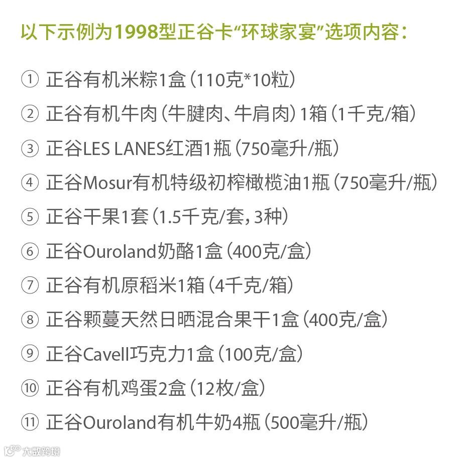 2020端午正谷卡,卡内包含环球家宴、每月优选等六种食品组合,任选其一,我们用心甄选自环球优势产区的优质食材,汇聚成一桌分享情谊的初夏家宴。