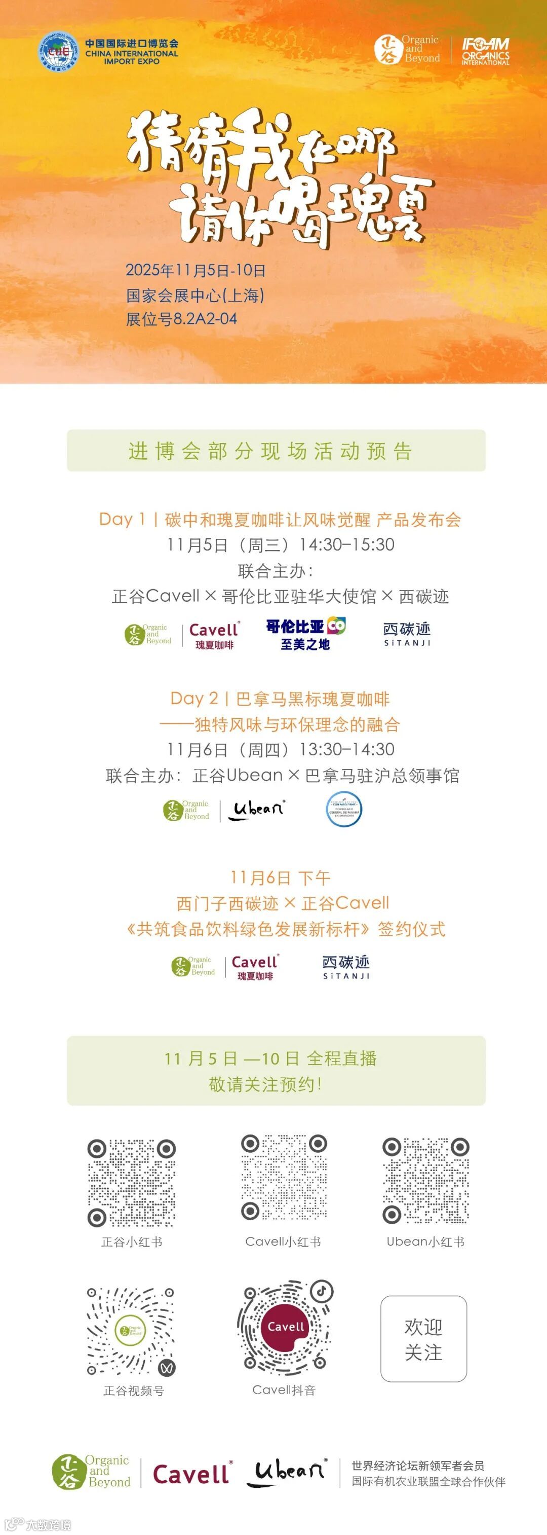 展会期间,多场主题活动将带您解锁风味:来自哥伦比亚与巴拿马的瑰夏咖啡,从产地风土到杯中香气,每一口都是优质与可持续的具象表达。活动将通过正谷CavellUbean小红书、视频号、抖音全程直播,正谷团队伙伴们也将化身“咖啡主播”,带您一起探索零碳咖啡的诞生之旅——从哥伦比亚的安第斯山脉,到巴拿马巴鲁火山脚下,一颗咖啡果如何在阳光、海风与生态循环中发酵出独特的香气。现场更有咖啡冲煮展示、风味品鉴与互动试饮环节,让每位观众都能在一杯咖啡中感受地球的呼吸与生命的温度。
