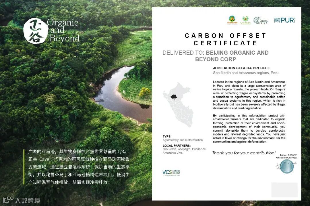 正谷有机米粽中的巧克力食材,践行可持续理念。可可种植是导致南美洲森林肆意砍伐的因素之一,这不仅加速了世界范围内森林覆盖率的下降,而且由于单一化的栽培导致了土壤退化和生物多样性的丧失。Cavell巧克力于2012年就获得了碳中和认证。正谷可可合作社ACOPAGRO参与秘鲁当地的森林再造更新项目,建立复混林生态系统,涉及可可、果树和用材树的混合种植,并近似模拟了可可的原始雨林栖息地生态。存在于该系统中的各种植物相互受益:高大的植物提供遮荫,可可在阴凉的灌木丛中获得更好的生长[8]。