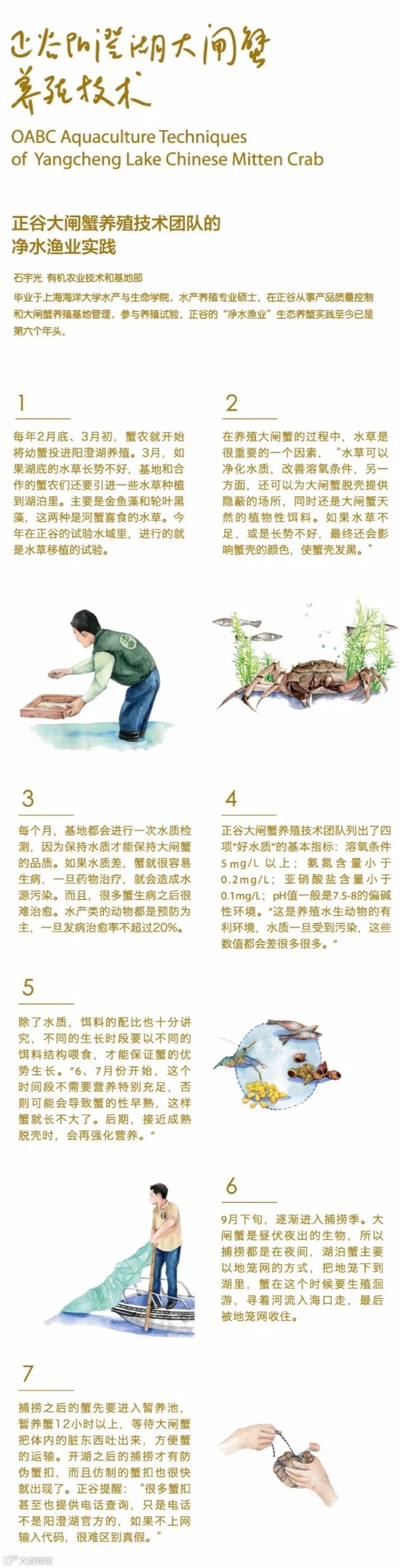 正谷从产地选择、基地建设、生产示范、标准控制与质量追溯等环节严格把控,确保生态大闸蟹符合正谷优质产品标准和质量控制体系要求。