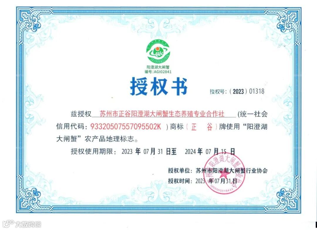 阳澄湖大闸蟹被授予“阳澄湖大闸蟹农产品地理标志保护产品”。每一只正谷阳澄湖大闸蟹都有政府颁发的蟹扣,蟹扣上标明官方查验渠道,可微信扫码查询以进行真伪验证。