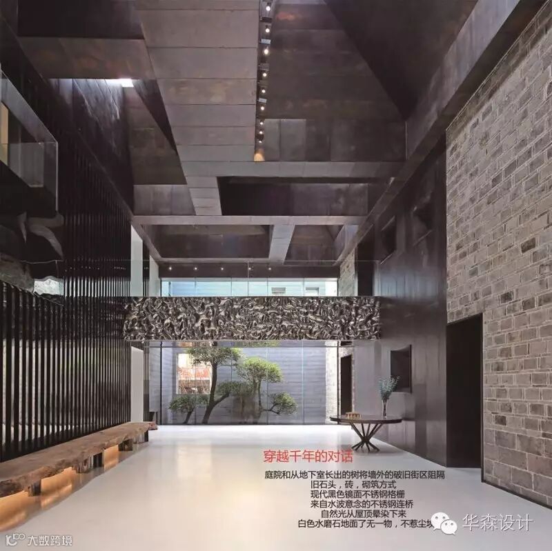 老西门窨子屋自东向西,分为三个并列的轴线,东厢为以围绕水庭院若干小天井构成的现代窨子屋部分,西厢从南至北,以三个庭院将老窨子屋串联在一起,中央轴线以南北庭院中央双层通高大厅的方式,将传统与现代,黑色镜面不锈钢和纯白的墙面,对照明代的砖石,阳光从天顶射下,纯无一物的白色水磨石地面如画纸,任光影挥洒。