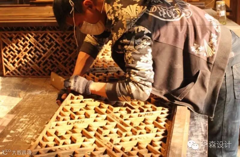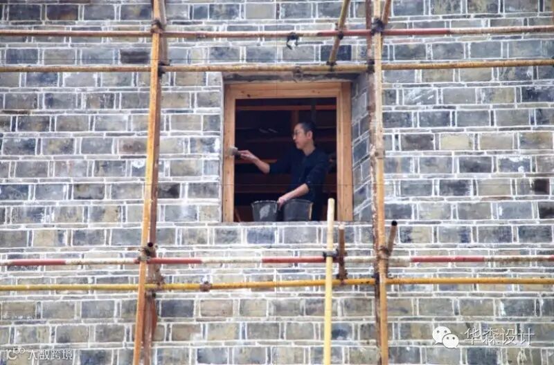 我们从江西找到了符合建筑师心目中窨子屋等级的直径40cm的彬木,在桃源乡下找到了做过传统木屋的木匠李师傅,50岁的他是工匠中唯一能读懂建筑图纸的人。李师傅65岁的师傅莫师傅也在我们的木匠团队中。从浙江东阳我们请来了胡先民先生,与我们一起研究重点雕刻部位的主题与雕刻方式,木构之间的衔接方法。我们从北京请到有多年古建经验的沈老师,帮助我们完成整栋木建筑如历百年的表面做旧工艺。而带着明代白灰浆与青苔的砖瓦与青石,是无需做旧的,我们只是按照灌斗墙的做法重新砌筑,将时空挪移些许而已。