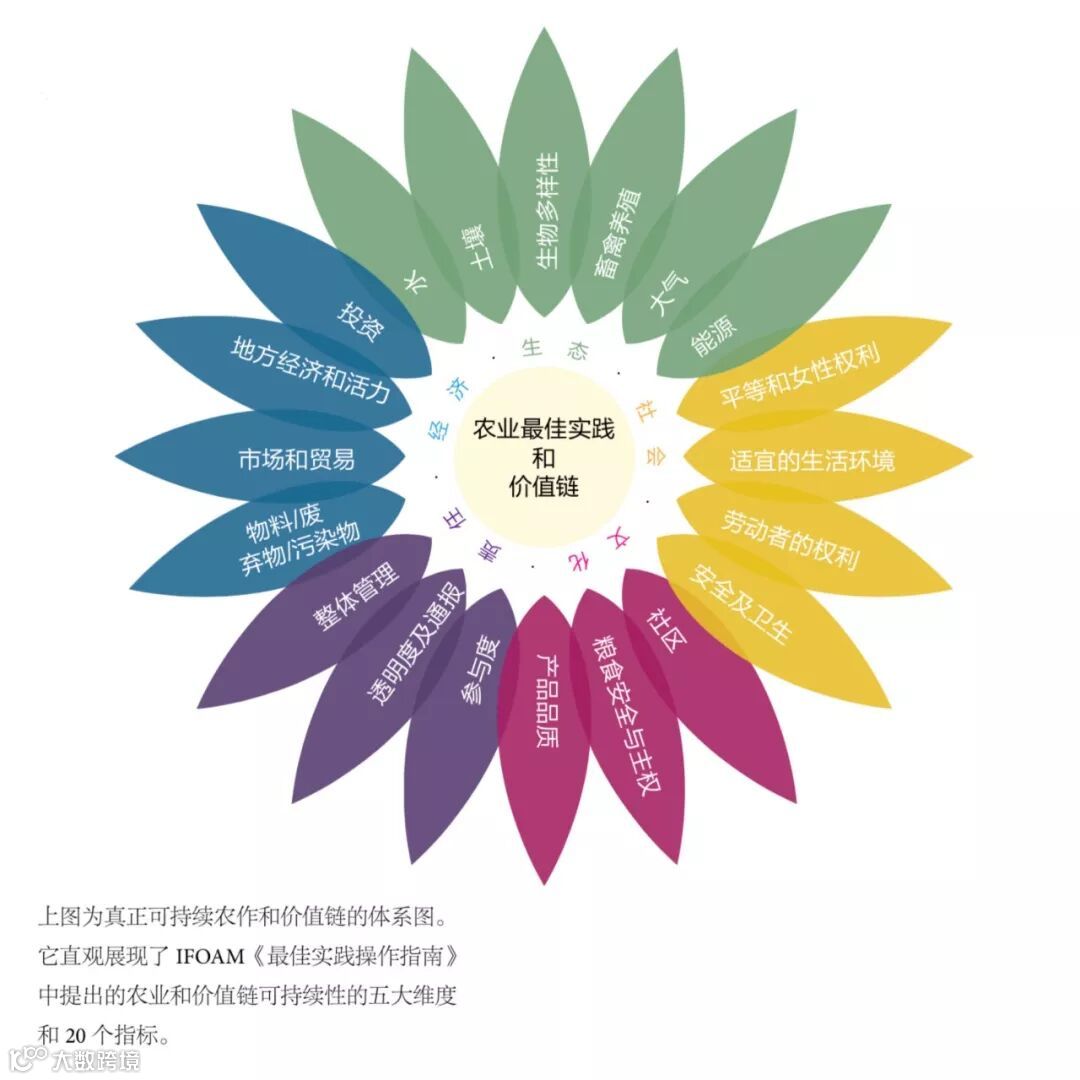 手册将农业可持续目标划分成五大维度:社会、生态、经济、文化、与责任;每个维度又根据有机运动的价值和方法,以及最优解决方案,进一步细分成不同的方面进行讨论。最终希望通过实现不同维度目标,最终推进农业可持续目标实现。