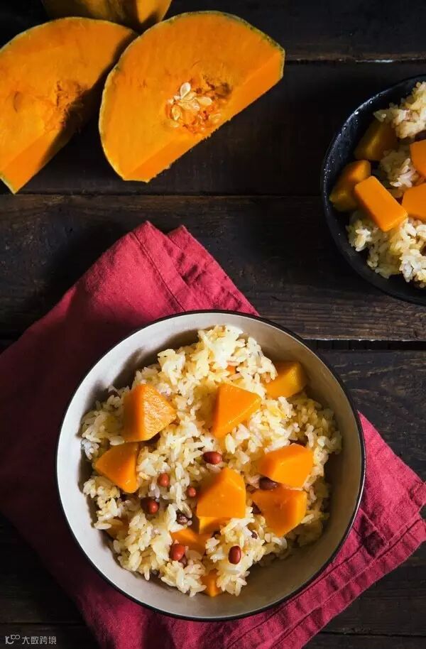 煮熟的有机南瓜与有机红豆饭组合搭配。