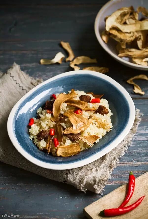 松茸炒香,加咸香古法手制肉丁,辣椒切圈依个人喜好添加,