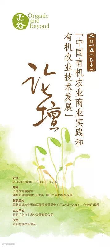 本次展会期间,将举行由正谷主办的2015 “中国有机农业商业实践和有机农业技术发展”论坛,届时将会发布《2015年世界有机农业概况与趋势预测》,与有机行业资深从业人、认监委专家、丹麦农业和食品委员会顾问、有机认证机构专家等共同探讨中国有机商业实践,分享有机生产技术和理念。欢迎大家前来参加!