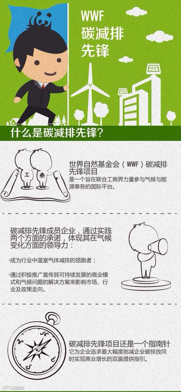 Tips:世界自然基金会碳减排先锋项目是一个旨在联合工商界力量参与气候与能源事务的国际平台。碳减排先锋成员企业通过两个方面的承诺体现其在气候变化方面的领导力:一是成为行业中温室气体减排的领导者;二是通过积极推广宣传其可持续发展的商业模式和气候问题的解决方案来影响市场、行业及政策走向。碳减排先锋项目还是一个指南针,它为企业追求最大幅度削减企业碳排放、同时实现商业增长和品牌提升的公司提供宝贵指引。