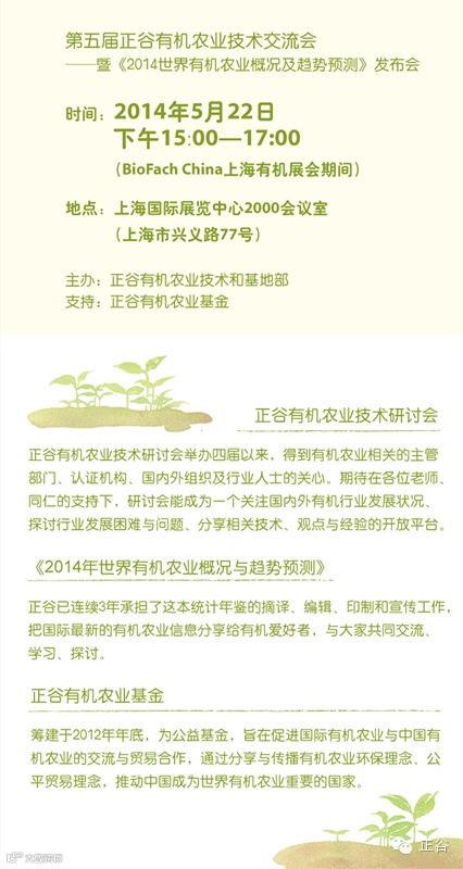 第八届BioFach China中国国际有机食品博览会将于5月22-24日在上海国际展览中心隆重开幕。届时,第五届正谷有机农业技术交流会也将如期举办。