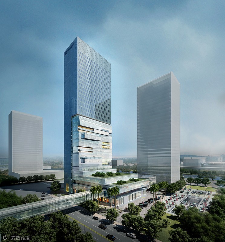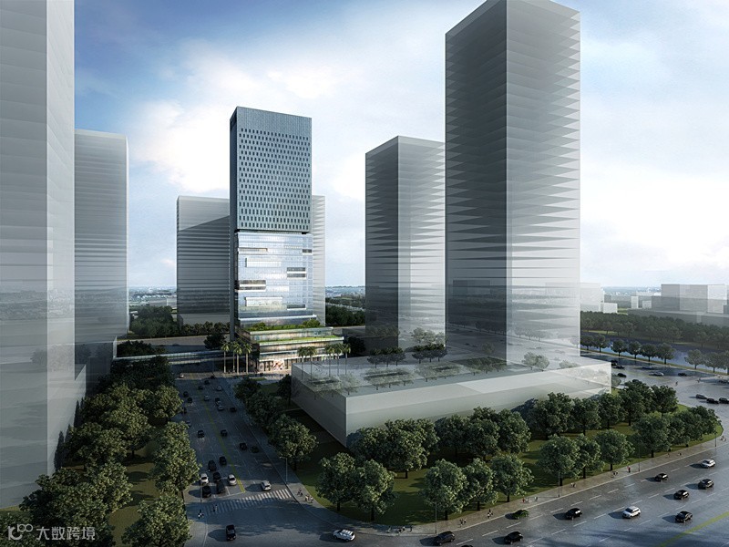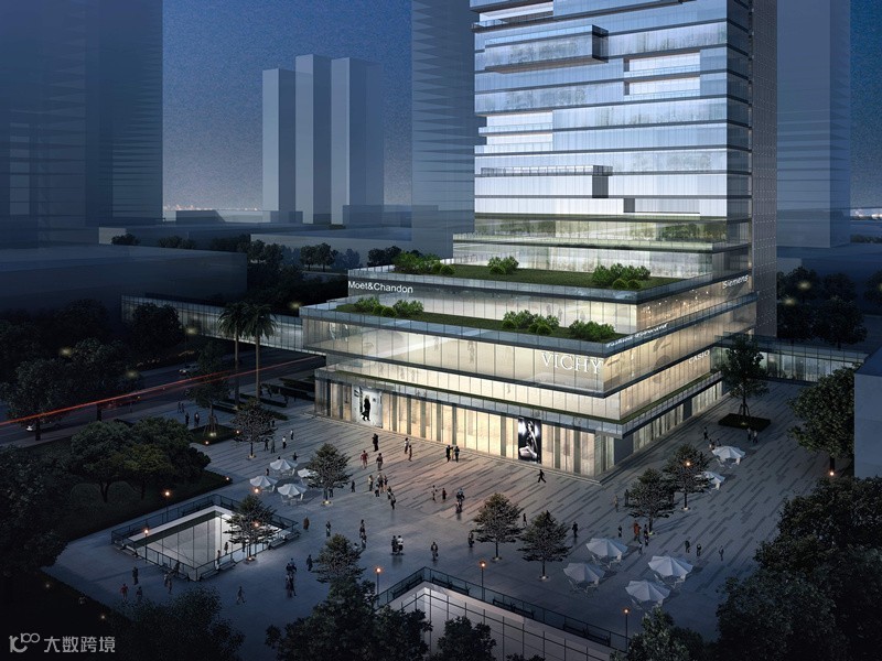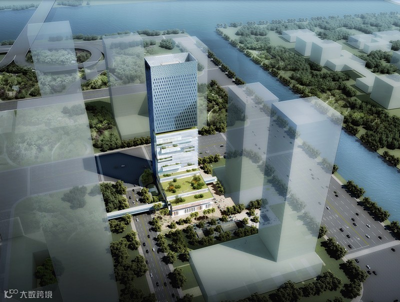 方案一的设计,力图形成两个个性鲜明的形象。面向主干道及澳门一侧,整体设计显得非常完整,而面向地块内侧,整体设计表现得更加丰富、多元。商业裙房的体量自然地延续至塔楼,同时也将裙房顶部的绿化元素一直向塔楼衍伸,形成别具一格的商业形象的同时,也为塔楼办公部分带来了一些生态的气息。这样的设计思路之下,塔楼的功能布局亦可做两种尝试:上部完整的体量适合酒店功能的布置,而下部办公又能获得绿色生态的环境;如果将酒店布置在塔楼下方时,位于塔楼上部的办公又能获得非常好的景观视野。