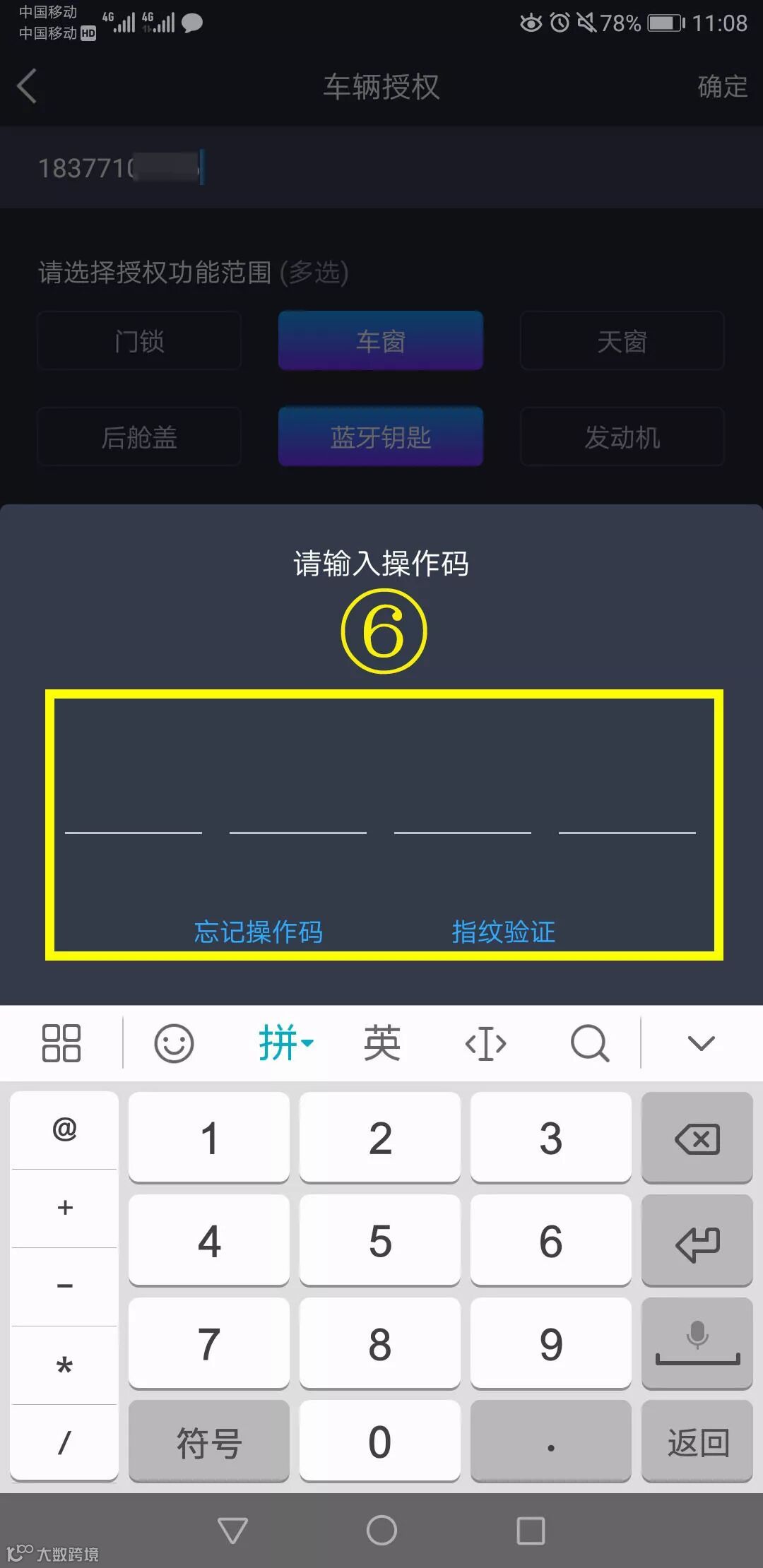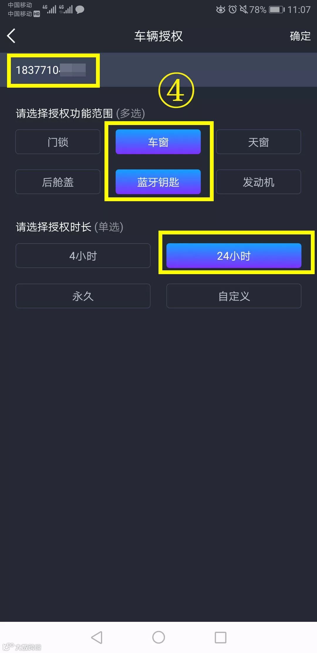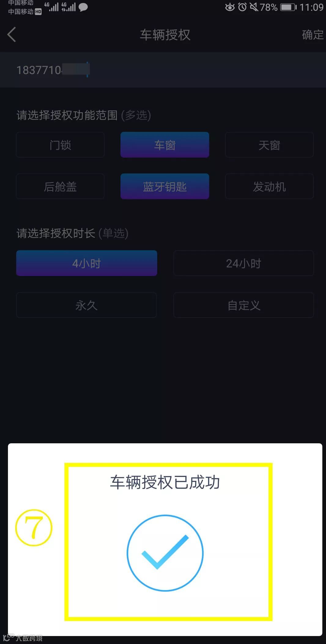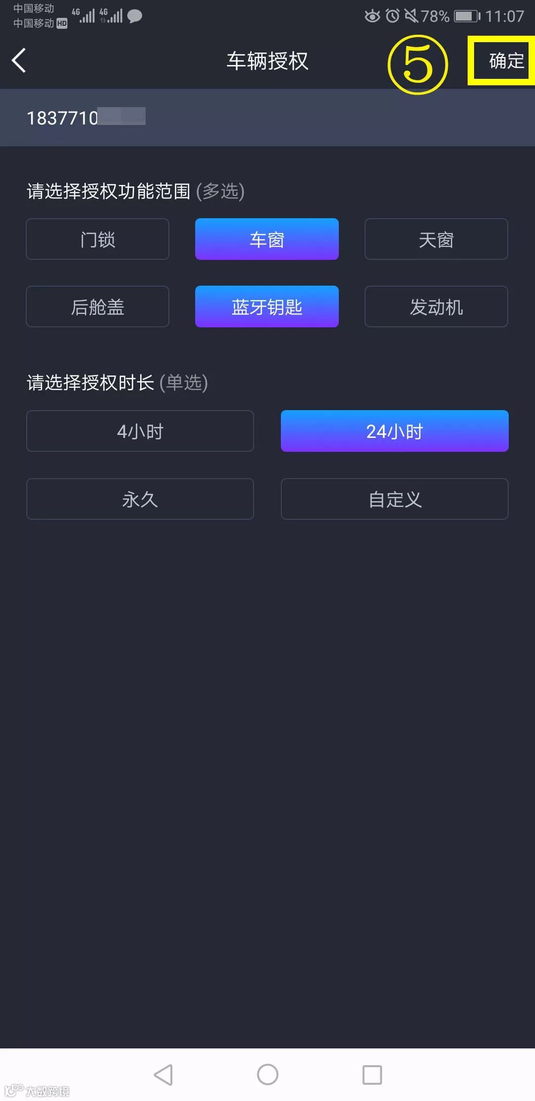 输入被授权人的手机号,选择授权的功能范围及授权时间