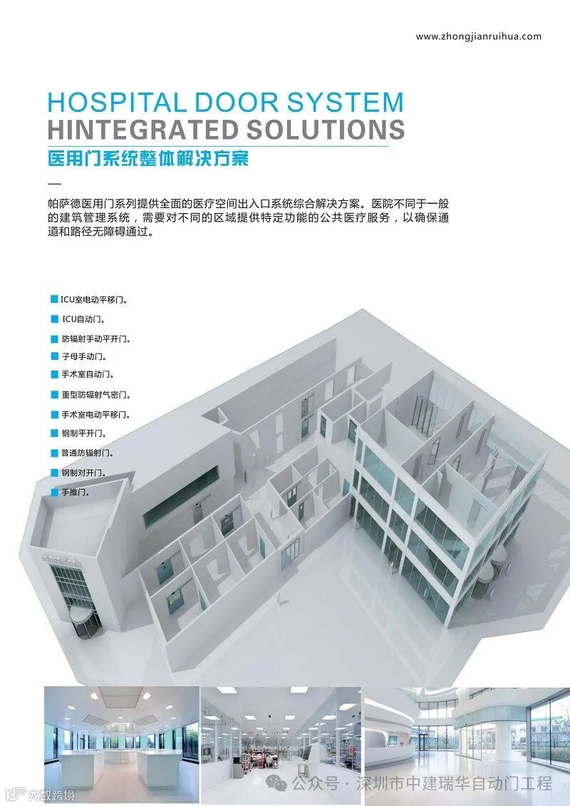 中建瑞华医用门系列为医用门系统提供了整体解决方案,涵盖了医院的各个区域。从ICU室电动平移门到手术室自动门,从防辐射手动平开门到重型防辐射气密门,满足了不同区域的特定功能需求。
