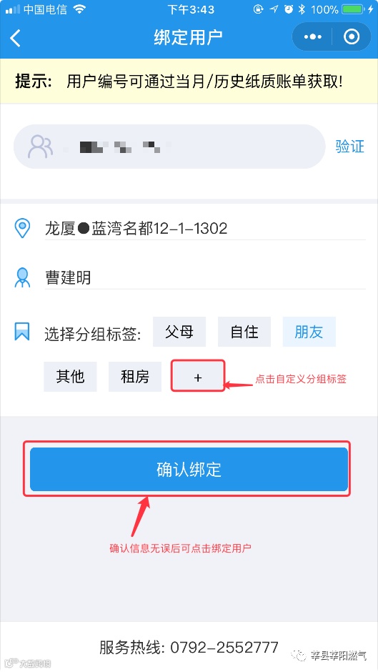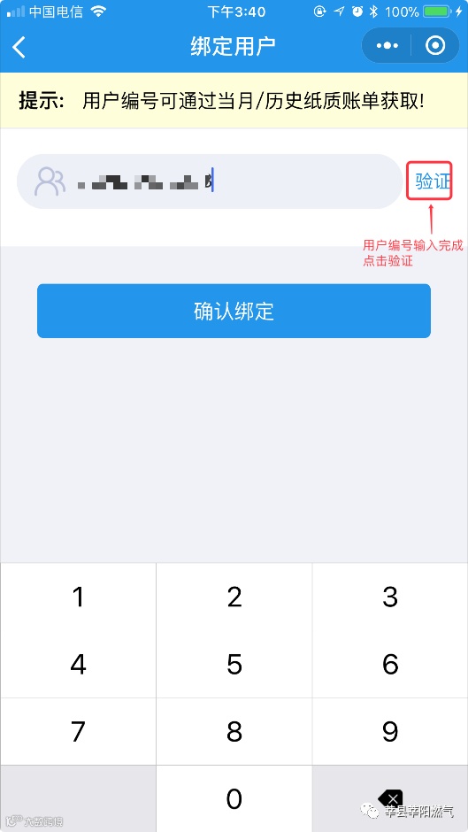 1.小程序进入后如图2.1所示, 先输入用户编号/表号/外部编号,点击验证,验证后将出现用户信息,确认用户信息后点击绑定.