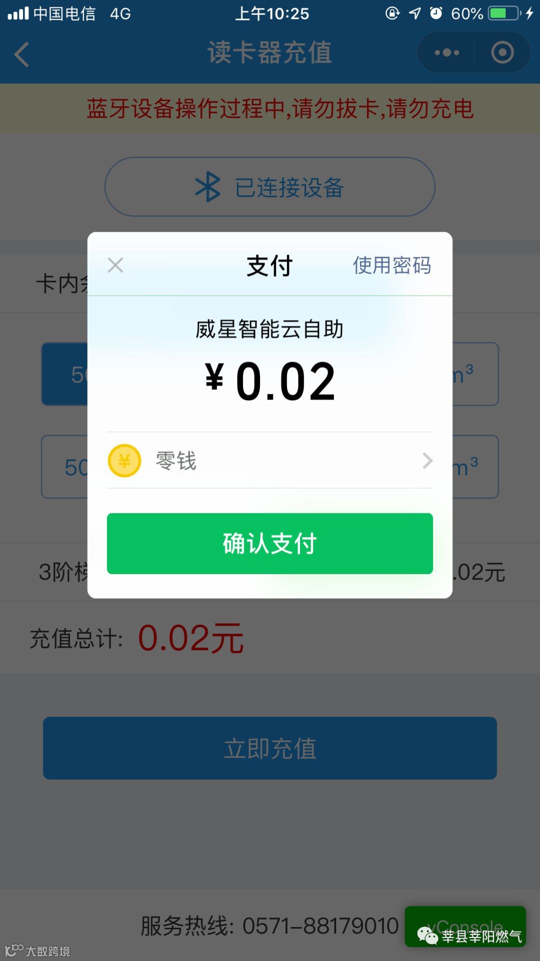 4.调起微信支付界面,进行付款操作,如图2.7,确认支付后充值完成。