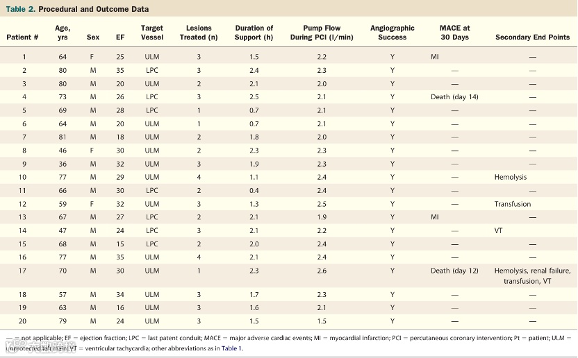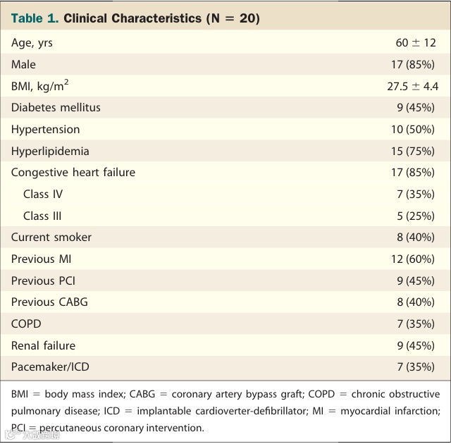 前瞻性、多中心、单组研究分析了20位高危PCI患者(来自于2个国家7个地区)。入组特点:LVEF≤35%,包括无保护左主干或只有一支血管通畅。