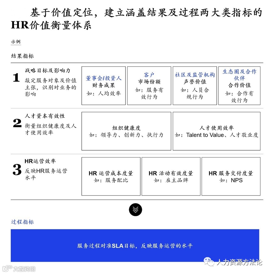 为了更好说明HR的价值主张并衡量其交付成果,需要建立结果及过程指标的HR价值衡量体系。结果类指标主要从以下三个维度衡量HR价值: